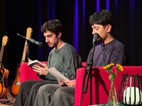 Als Vorleser/-innen waren Ali und Ronak aus der S3, sowie die Lehrerinnen und Lehrer Herr Lichte, Frau Vispää-Rasch, Frau Schreyer und Frau Marlow auf der Bühne und haben mal im Dialog, mal solo oder multimedial vorgelesen.